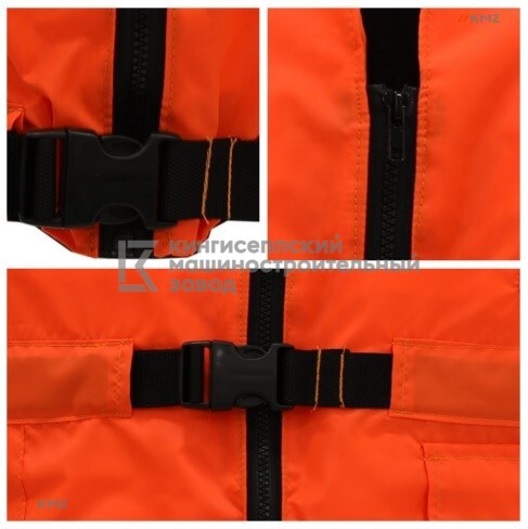 Жилет страховочный рабочий ЖСР-1 снабжен свистком с креплением и светоотражающими полосами, застегивается на молнию, имеется два регулировочных ремня, позволяющих легко подгонять жилет по фигуре человека, на полочках расположены два кармана. Изделие изготавливается под техническим наблюдением РМРС и РКО в двух размерах: 44-52 и 54-62.
